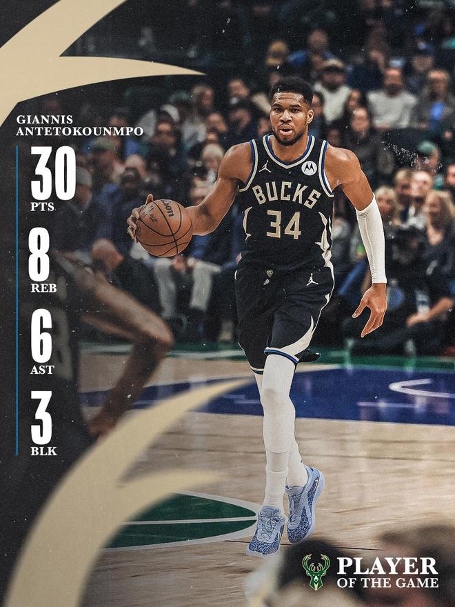 無可匹敵,字母哥18中11砍30分8板6助1斷3帽,末節(jié)獨攬15分